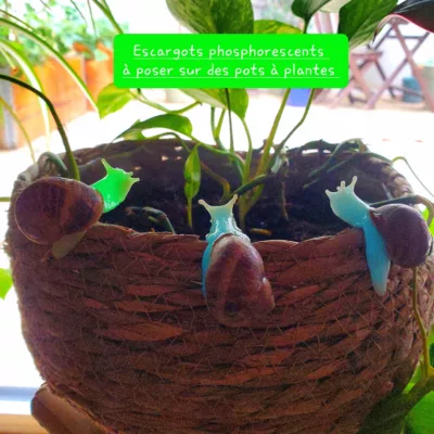 Veilleuses phosphorescentes bleues et vertes escargots à poser sur un étagère ou un pot de fleurs déco halloween