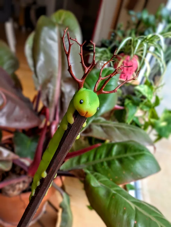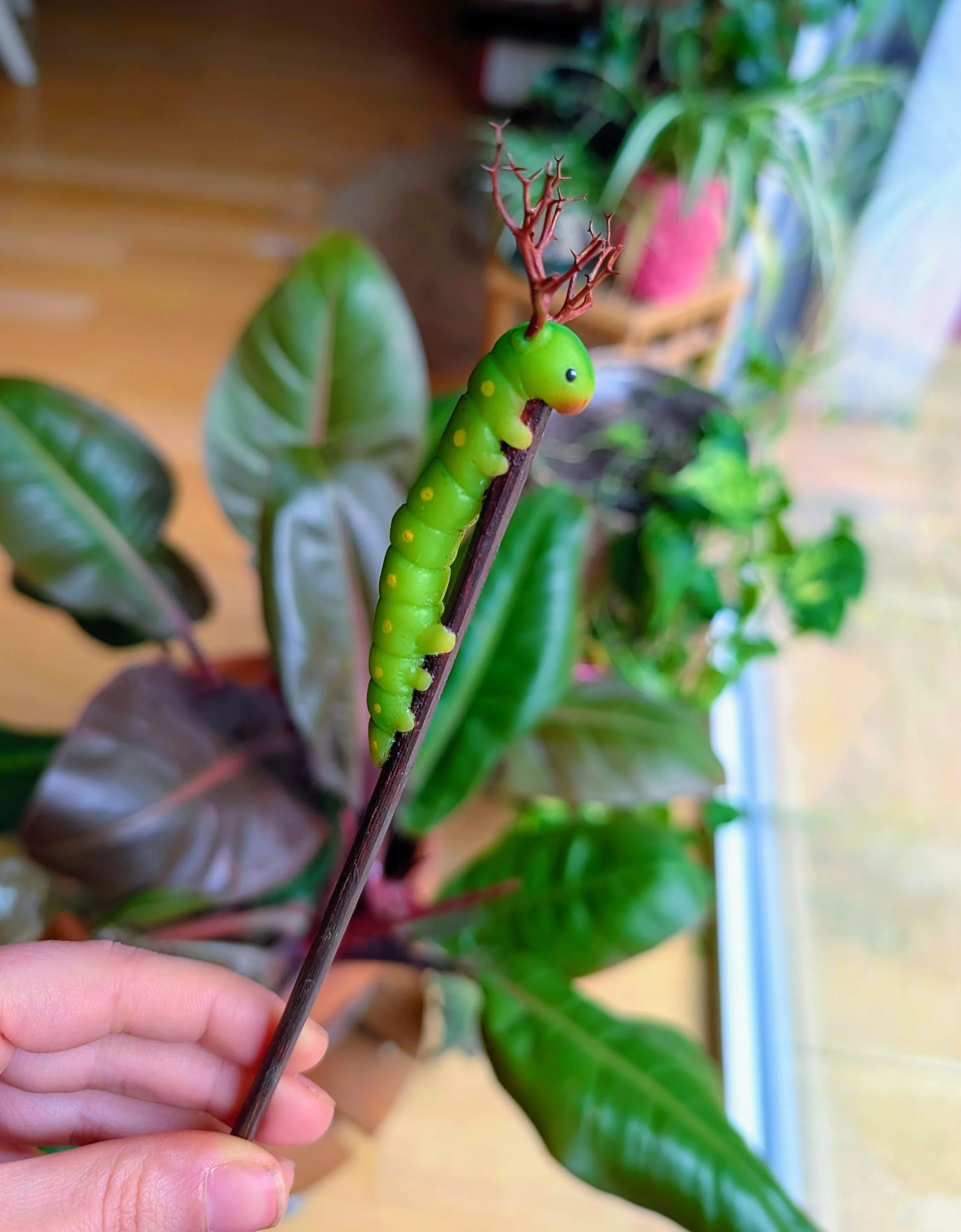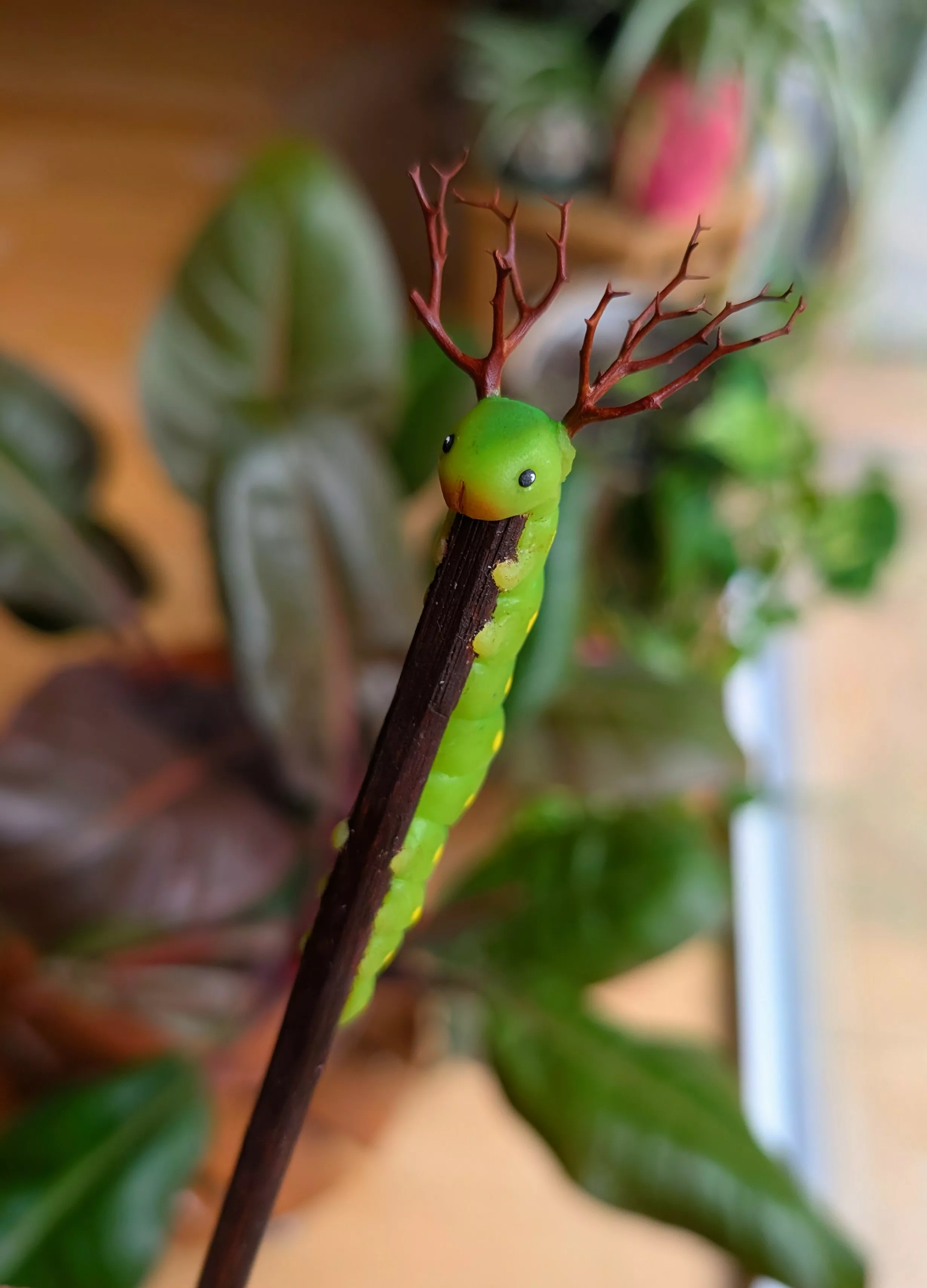 Cette chenille (6 cm de long) est inspirée d’une espèce bien réelle nommé « japanese emporor caterpillar ». Ses cornes sont en bois récupéré dans la nature par mes soins. Chacune des baguettes est unique faite à la main, il peut donc y avoir des variantes entre les photo et la réalité.