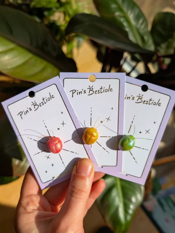 Mes scarabées sont en pate polymère sculpté à la main puis recouvert de poudre pailletée et résiné !